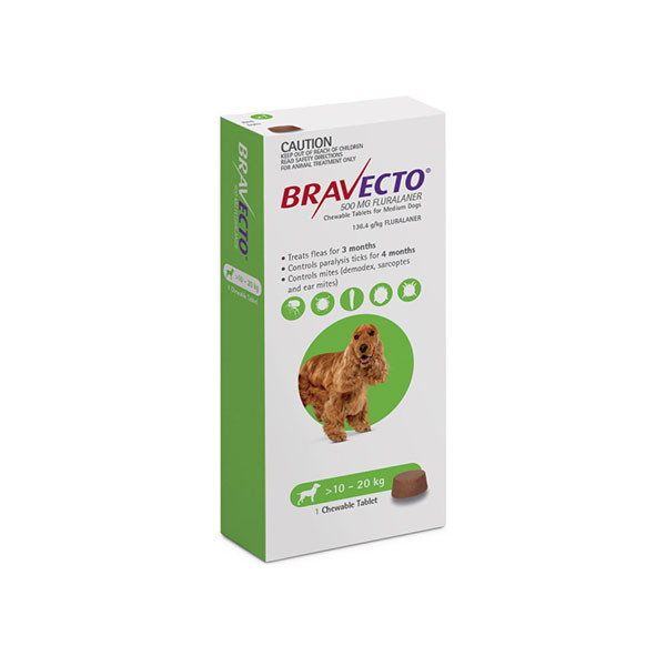 قرص ضد کک و کنه سگ براوکتو – Bravecto (10 تا 20 کیلو) اولین جویدنی است که تا ۱۲ هفته محافظت از کک و کرمهای خارجی را فراهم میکند. یک جویدنی باعث میشود که حیوان خانگی شما از ۴ نوع کرم (کرم سیاه پا، کرم سگ آمریکایی، کرم سگ قهوهای و کرم ستاره تنها) و ککها محافظت شود. براوکتو در عرض ۲ ساعت شروع به کشتن ککها میکند و جلوی بروز عفونتهای جدید را هم میگیرد.